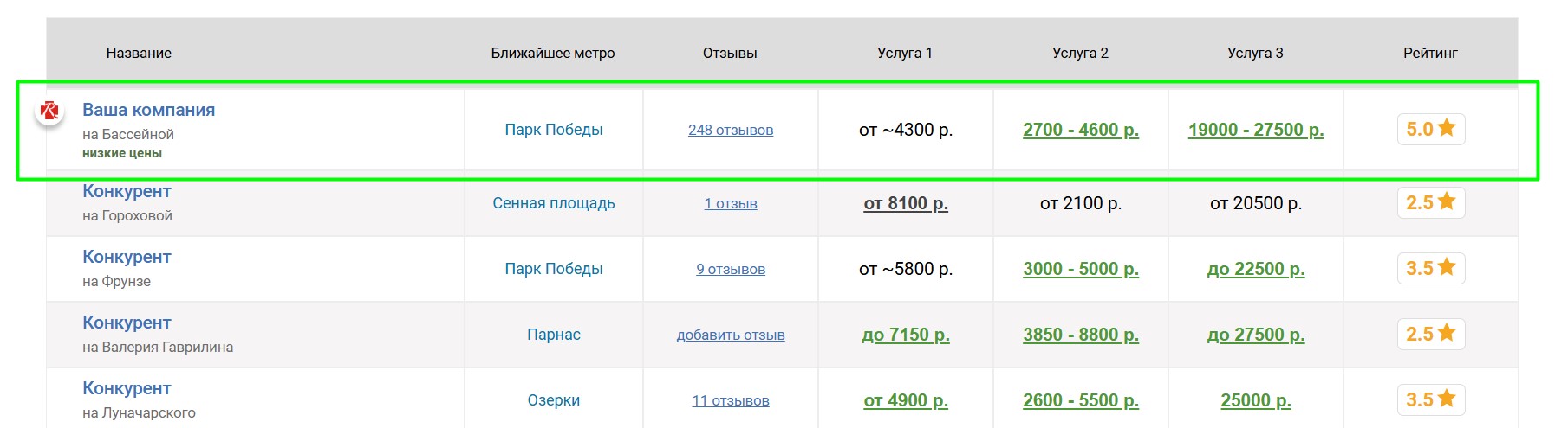 ателье, продвигаемое ателье попадёт к ним в таблицу «Сравнение по ценам», которая выглядит следующим образом: